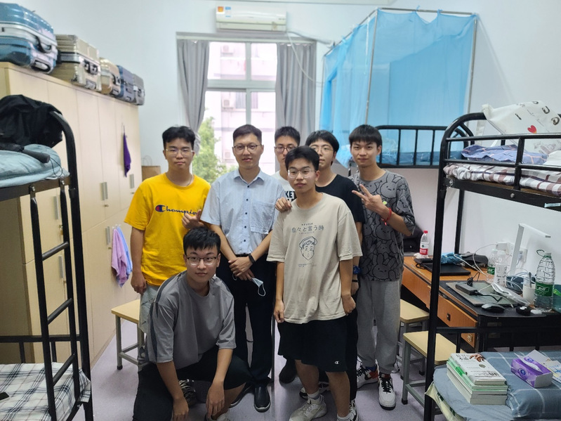 图为吴杰走访宿舍时与新生合照