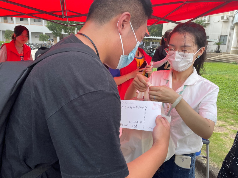 宿舍楼前是迎新另一道别样的风景线。志愿者们热情引导小21们登记、测体温、领钥匙;耐心回答小21们的问题,安抚担心的家长们;主动帮忙卸下行李、照看行李、搬运行李。宿舍门前是他们的阵营,楼道间是他们的身影,汗水里是他们的真心。“谢谢啊,一直忙上忙下的,一头汗呦。”新生家长心疼地说。行人来来往往,他们始终站在最显眼的地方。“需要帮忙吗?”这是他们一天里说的最多的话,却往往等不及回答,就小跑迎上去抢着干活了。实行轮班制的他们,在下一班没有到来前,就绝不会离开岗位,以此保证在新生需要帮助的地方,他们一直都在。