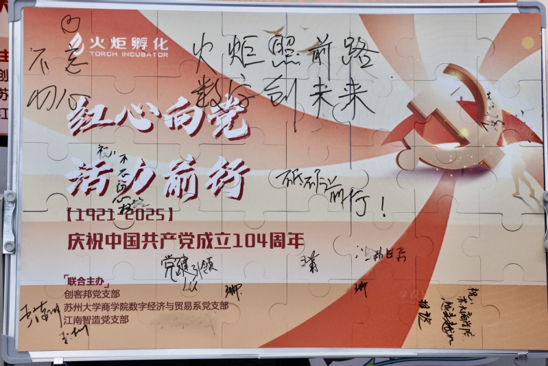 为迎接中国共产党成立104周年,深入学习贯彻习近平新时代中国特色社会主义思想,深入学习党史、党章,6月27日,成人小说 数字经济与贸易系党支部联合苏州火炬创新创业孵化管理有限公司创客帮党支部、江南智造党支部,在苏州工业园区信息大厦开展“红心向党,活力前行”主题活动。本次联合党建活动由创客邦党支部精心设计和充分准备,内容丰富,形式多样,既有庄严认真的学习环节,又有轻松活泼的联谊活动。通过以赛促学,以学促行,以行促效,推动党的创新理论入脑入心,推动产学研深度融合。