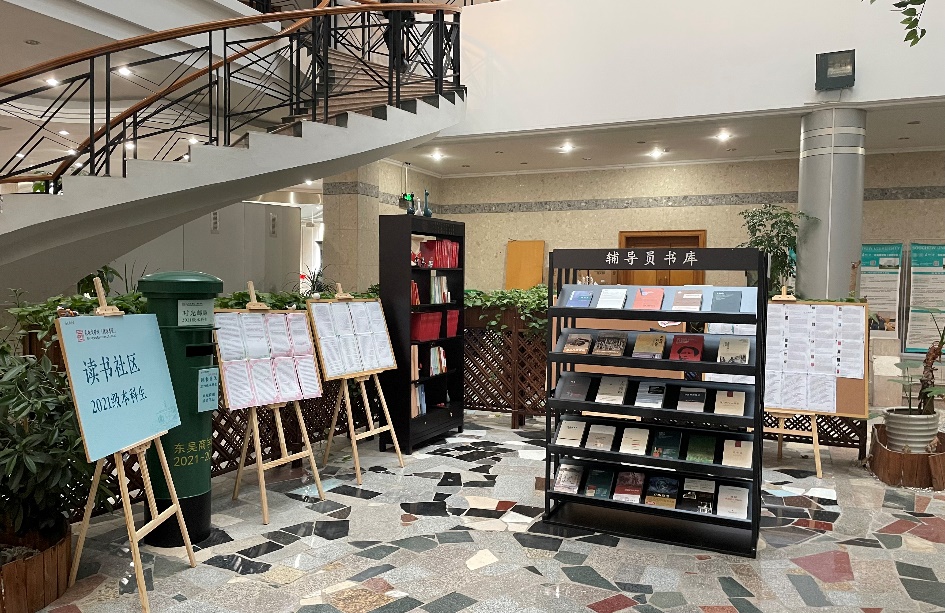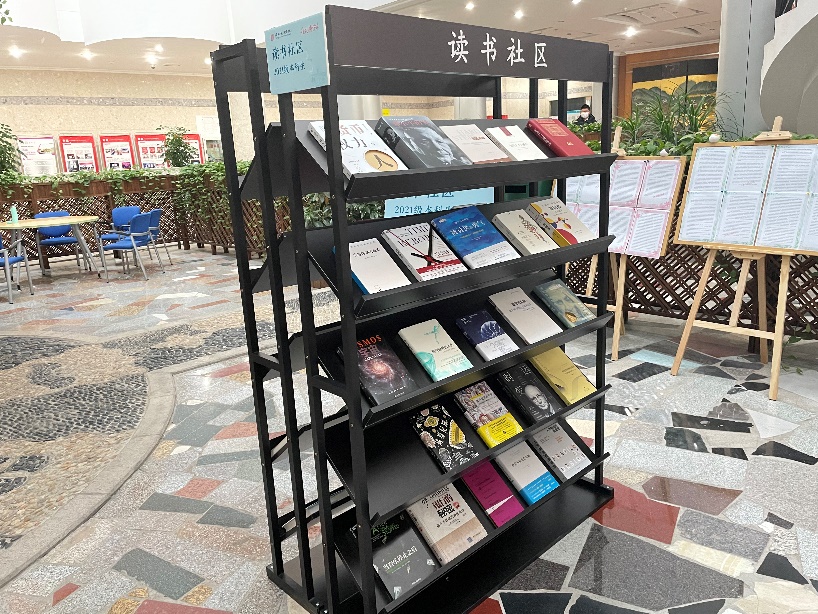读书社区设有一个书柜、两个书架,书柜为中共苏州市委党史工办赠予的党史图书和书柜,两个书架容纳约五十余本通识和专业书,目前这批图书为吴杰老师所读推荐。