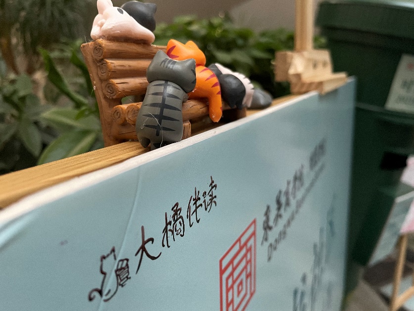 读书社区两侧竖立了两个大展板和三块留言板。两块大展板为书目简介,其中一块为配合近期书架书目,内容为吴杰老师推荐书目对应提供的简短附注。三块留言板展示优秀读书笔记和读后感悟,21级工商管理类、经济学类和金融学中外合作办学三个班的读书笔记将会在这些留言板上展出,定期更新。每块留言板上都配有猫咪周边,与读书社区“大橘伴读”相呼应。