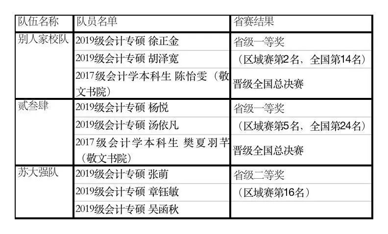 备战区域赛期间,队员们在老师们的指导下进行认真的训练,扎实掌握了实务系统各个模块的操作,也提升了自己的应用能力。4月11日,队员们参加了南京赛区的比赛,并取得了不错的成绩。三支队伍分别列南京赛区第2名、第5名和第16名。两支队伍荣获省级一等奖并成功晋级全国总决赛,一支队伍荣获省级二等奖。