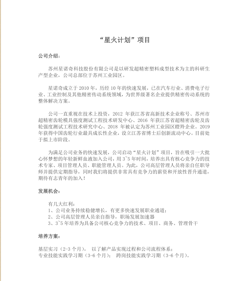 苏州星诺科技股份有限公司“星火计划”项目