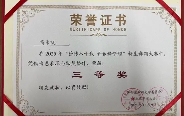 在大家的共同努力下,本次大赛商院荣获了新生舞蹈大赛三等奖!感谢台前幕后的舞者和工作人员的辛勤付出,感谢学院老师们给予的大力支持。希望全体同学带着这份美好与激情,在大学生活中继续绽放无限光彩!