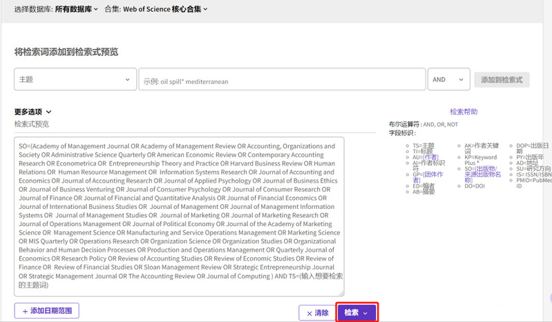 SO=(Academy of Management Journal OR Academy of Management Review OR Accounting, Organizations and Society OR Administrative Science Quarterly OR American Economic Review OR Contemporary Accounting Research OR Econometrica OR Entrepreneurship Theory and Practice OR Harvard Business Review OR Human Relations OR Human Resource Management OR Information Systems Research OR Journal of Accounting and Economics OR Journal of Accounting Research OR Journal of Applied Psychology OR Journal of Business Ethics OR Journal of Business Venturing OR Journal of Consumer Psychology OR Journal of Consumer Research OR Journal of Finance OR Journal of Financial and Quantitative Analysis OR Journal of Financial Economics OR Journal of International Business Studies OR Journal of Management OR Journal of Management Information Systems OR Journal of Management Studies OR Journal of Marketing OR Journal of Marketing Research OR Journal of Operations Management OR Journal of Political Economy OR Journal of the Academy of Marketing Science OR Management Science OR Manufacturing and Service Operations Management OR Marketing Science OR MIS Quarterly OR Operations Research OR Organization Science OR Organization Studies OR Organizational Behavior and Human Decision Processes OR Production and Operations Management OR Quarterly Journal of Economics OR Research Policy OR Review of Accounting Studies OR Review of Economic Studies OR Review of Finance OR Review of Financial Studies OR Sloan Management Review OR Strategic Entrepreneurship Journal OR Strategic Management Journal OR The Accounting Review OR Journal of Computing ) AND TS=(输入想要检索的主题词)