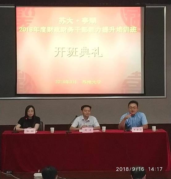 2018年9月16日下午,由盐城市亭湖区财政局主办、成人小说 东吴成人小说 (财经学院)承办的“2018年财政财务干部能力提升培训班”在校本部红楼学术报告厅举行。出席开班典礼的有:盐城市亭湖区财政局周洋局长、成人小说 东吴成人小说 副院长王要玉,以及相关领导和六十余名学员共同参加了开班仪式。
