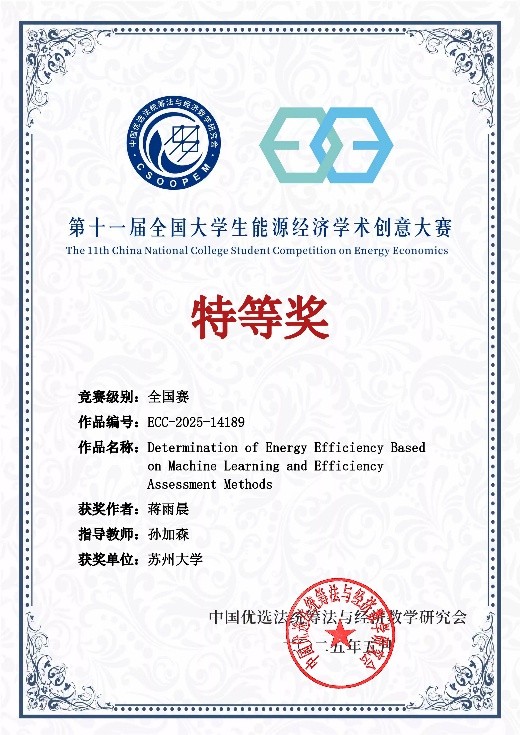 From 24th to 25th May, 2025, the grand final of the 11th National University Students' Academic Creativity Competition on Energy Economy, sponsored by the China Society of Preferential Methods, Integration Methods and Economic Mathematics, was held in Shanxi University of Finance and Economics and came to a successful end. In this competition, our student Jiang Yuchen won the Grand Prize of Graduate Student Group in the National Finals with his work ‘Determination of Energy Efficiency Based on Machine Learning and Efficiency Assessment Methods’. The instructor, Professor Sun Gassen, won the ‘Excellent Instructor Award’.