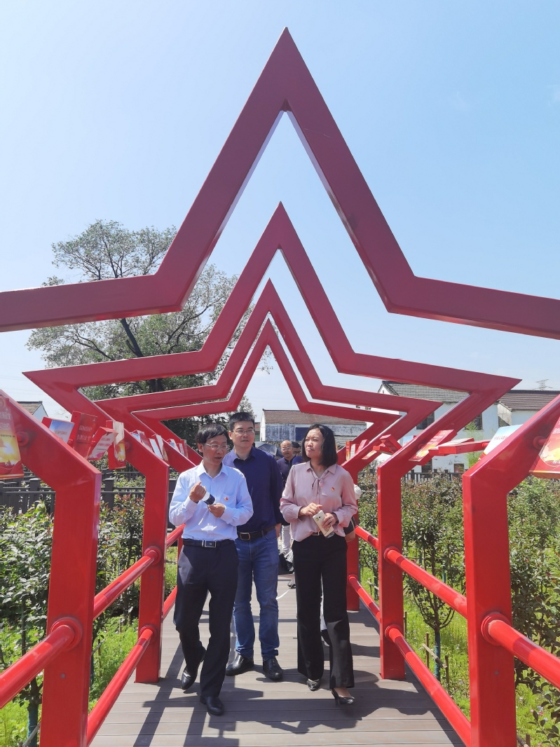 调研组还参观了丹阳市访仙镇的红光村。2020年11月20日,红光村被中央文明委评为第六届全国文明村镇,初夏时节的红光村,村内田园风光迤逦、河湖纵横交错、民宅错落有致,白墙黛瓦与小桥流水相映成景,宛若一幅江南最美乡村的新画卷。红光村现有20个自然村,36个村民小组,党员113人。红光村民营经济发达,拥有工业企业50余家,年产值近2亿元,生产的汽车零配件产品远销国内外。红光村以土地股份合作社为抓手,大力发展特色农业产业链,目前全村有超力生态园、天鹅绒紫薇产业基地、城市园林绿化景观树基地、草坪种植基地等现代高效观光农业企业10余家。这样做的好处是大量富余劳动力不仅可以定期获取土地股权收益,还能够从事其它行业或自主创业。此外,红光村积极推进红光村新时代文明实践站建设,创新推出了村“文明银行”引导村民自觉树立文明新时尚。以“家文化”为抓手,通过“微家”建设,家风家训征集活动、文化体育活动、志愿者活动、吸引群众广泛参与。