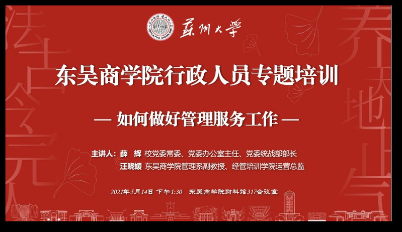 5月14日下午,东吴成人小说 行政人员专题培训在财科馆317会议室举行。学院特邀校党委常委、党委办公室主任、党委统战部部长薛辉和东吴成人小说 管理系副教授、经管培训学院运营总监汪晓媛就如何做好管理服务工作和职业化形象与公务礼仪进行了专题培训。学院党政领导班子成员、党委办公室综合科科长张雯和学院全体行政人员参加了培训。