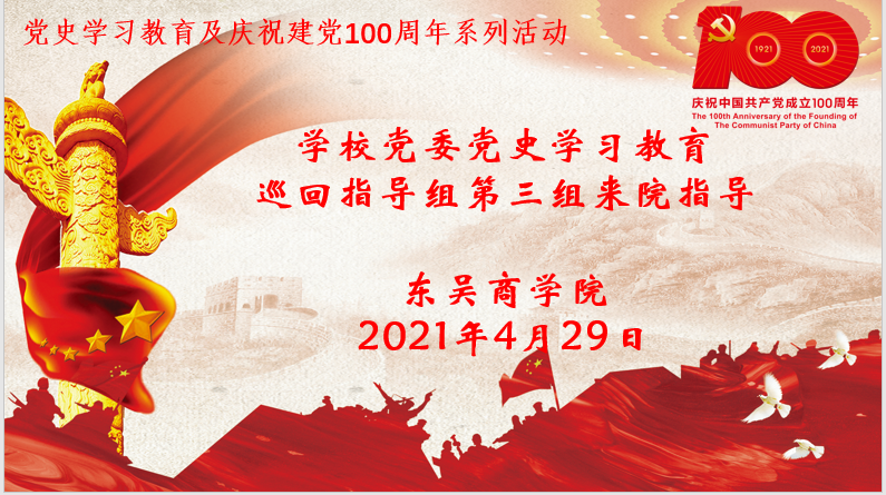4月29日,学校党委党史学习教育巡回指导组第三组组长、党委研究生工作部部长吴雪梅,校纪委副处职纪检员袁洁,国资处芮雪老师、后勤处张梦思老师来院指导党史学习教育。学院党委书记刘志明、党委副书记、副院长董娜、专职纪检委员马龙剑、专职组织员缪爱国参加会议。会议由学院党委书记刘志明主持。