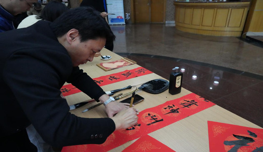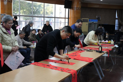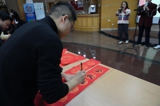 黄晓辉老师、国有资产管理处综合科主任芮雪老师和子曰书友会会长殷健为在场嘉宾撰写了颇是具有美好寓意和祝福的春联和年历卷轴。大家一同合影留念。