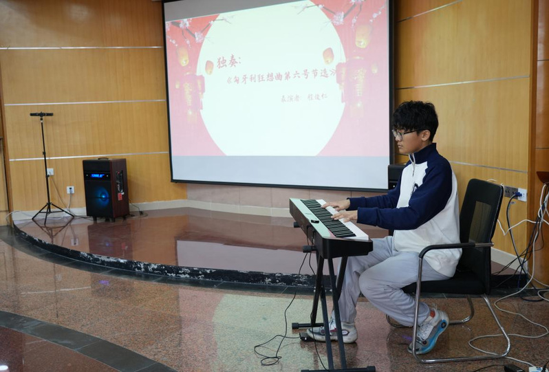 联欢活动正式开始,商院学子尽显风采。程俊仁同学的电钢琴独奏《匈牙利狂想曲第六号节选》,琴声激扬动人,点燃了活动的气氛;倪天罡同学的歌曲《如愿》《落叶归根》《perfect》悦耳动听,为退休老师们送上了充满活力的舞台表演。王俊杰和蓝晓婧同学的诗朗诵《等待》深情饱满,跟随两位学生走进一段光辉的历史,感受一位伟大科学家的崇高精神与不朽情怀。