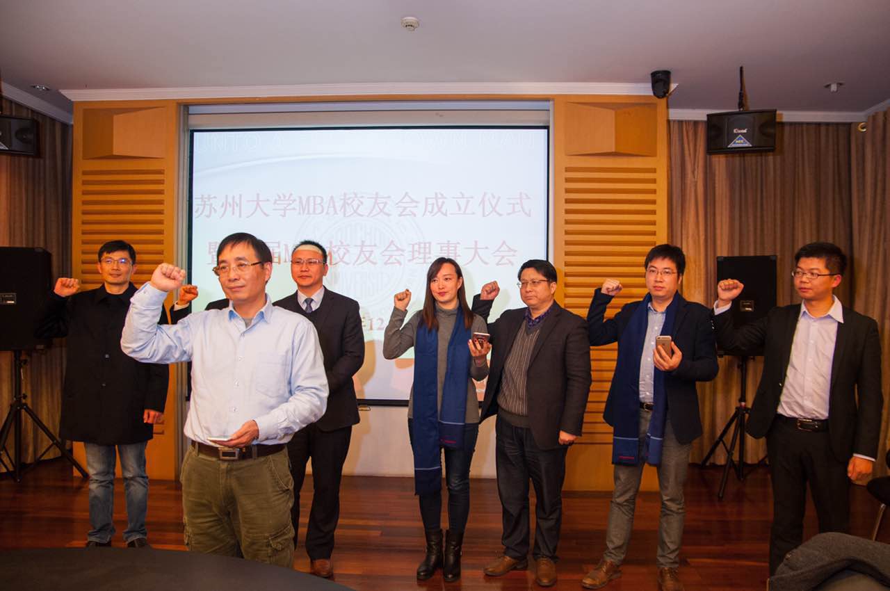 校友部部长管文文宣读首届MBA校友会的任命书,任命田柏忠为首届MBA校友会会长,黄荣、迮建军、余静华、胡涛、连治、张智慧、吴晓梅为副会长,姚远为秘书长。宣读结束后,会长田柏忠校友带领副会长和秘书长围绕校友会的口号“同门互助、幸福人生”为主旨进行了宣誓。田柏忠校友从情、利、义三个方面诠释了MBA校友会发起的初衷,从自身创业的经历谈到了了同门校友对自己事业、生活等方面的帮助和提升。向各位老师和校友代表阐明了第一届校友会将从组织、运营、公益、创业等方面加强校友会的建设,使校友会成为对接外部资源,沟通校友,联络学校的桥梁、平台和纽带。