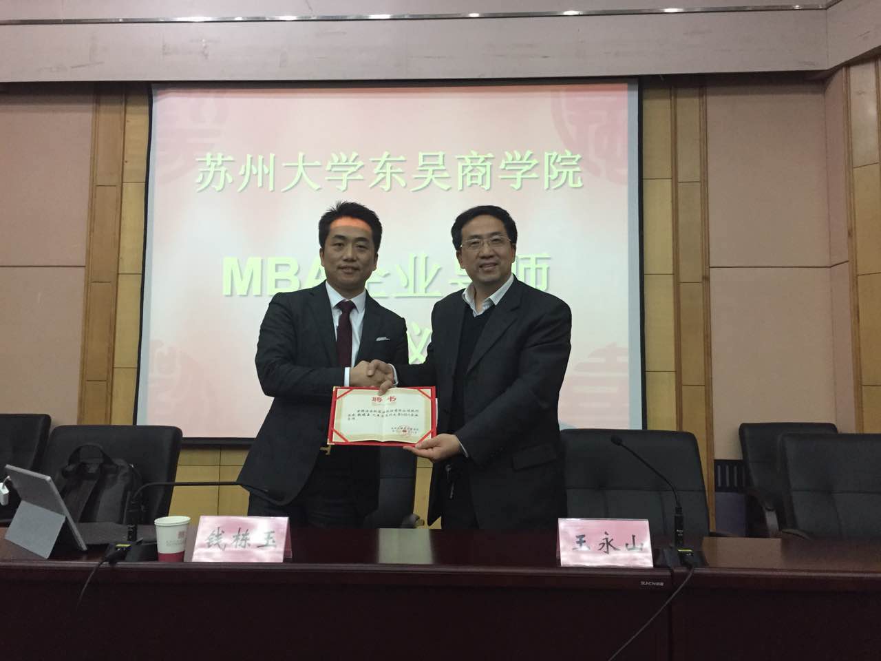 讲座开始前,苏大成人小说 书记王永山向钱栋玉先生授予企业导师聘书。钱栋玉先生历任江苏豪申家纺布艺有限公司常务副总经理、江苏圣夫岛纺织生物科技有限公司总经理等职,现任金轮蓝海股份有限公司执行总裁(深圳中小板上市公司,工业品细分领域世界冠军)。讲座由MBA中心主任俞雪华教授主持。
